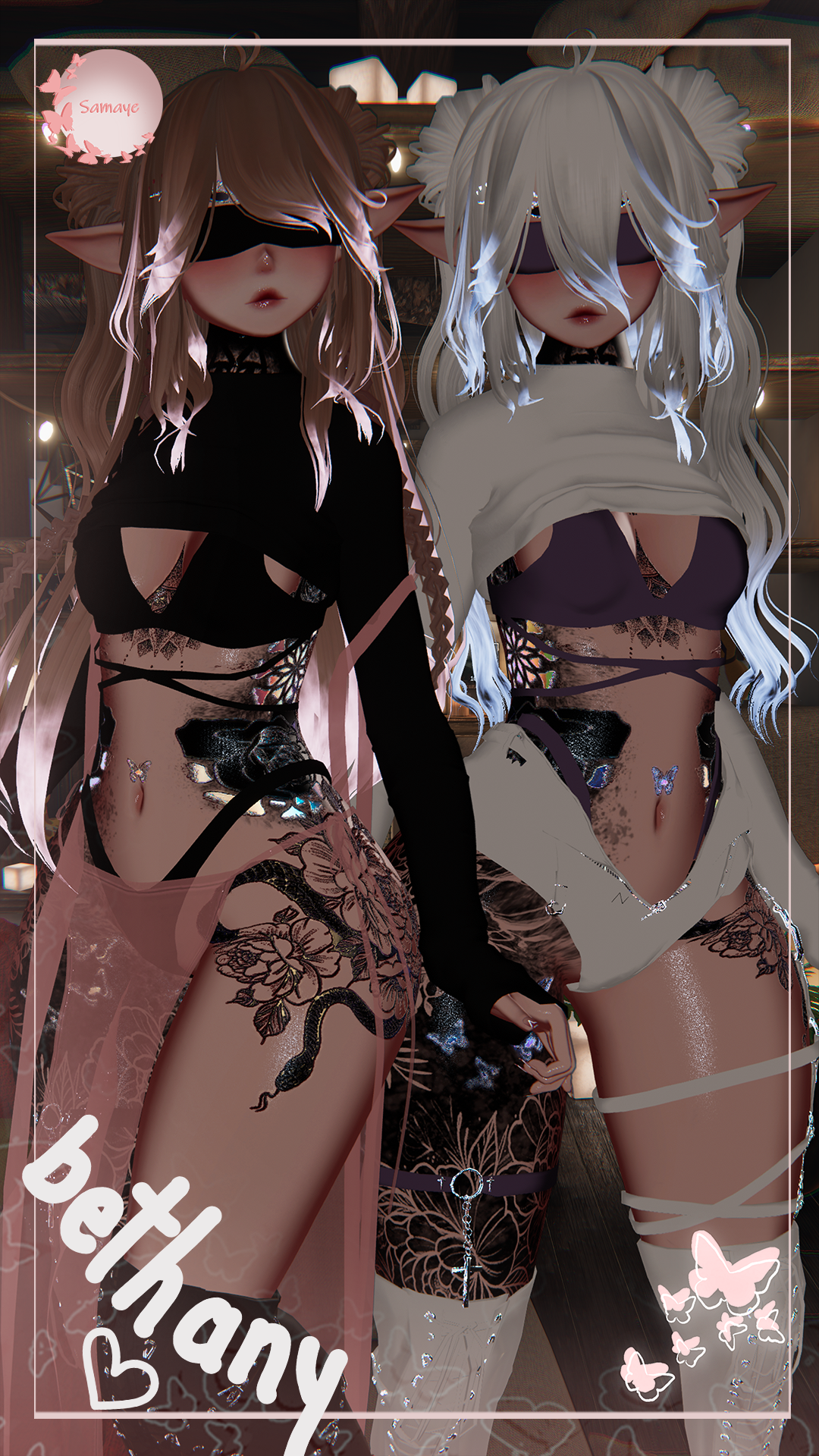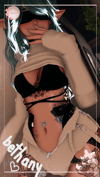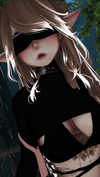 Body (edited by me), Face, Main Hair, Buns, Ears, Shirt, Bra, Undies, Robe, Tattoo, Shorts, Boots, Hand Chain, Leg Straps, Face Texture, Circlet, Nail Cuts, Blindfold