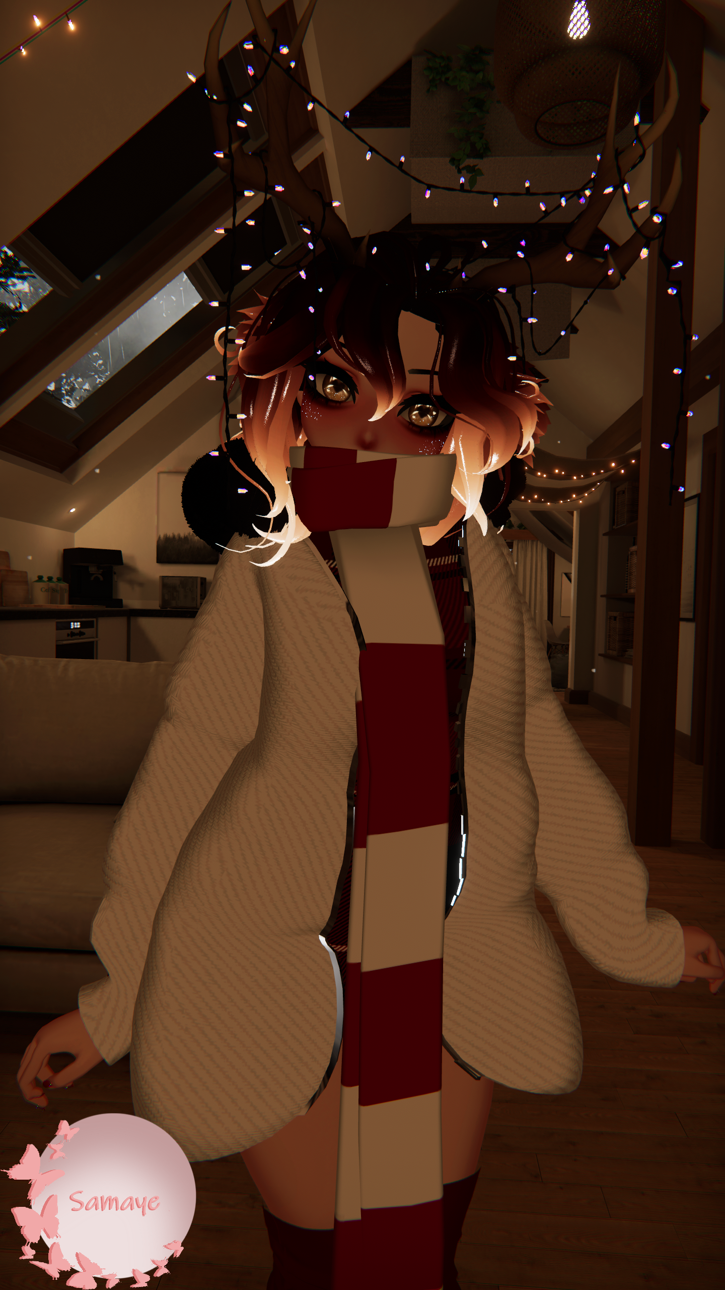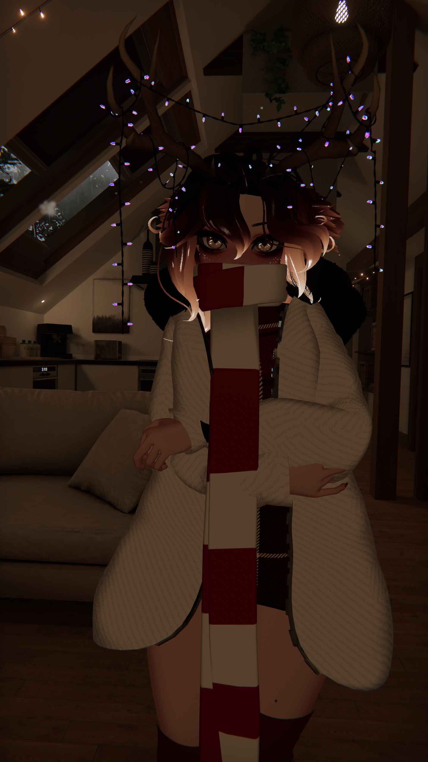 (Base) Pandaabear (Head) Mia#5107 and ничто#6666, (Eyes) WetCat#6969, (Ears) WetCat#6969, (Body Texture) Uni#1369, (Panties) brae#2007, (Socks) AQ#0999, (Dress) rinebean#1111, (Coat) rinebean#1111, (Shoes) frog#3079, (Reindeer Horns) YamuVR, (Nail Cuts) Yang#6669, (Hair) bunisu, (Scarf) FlyinChickin